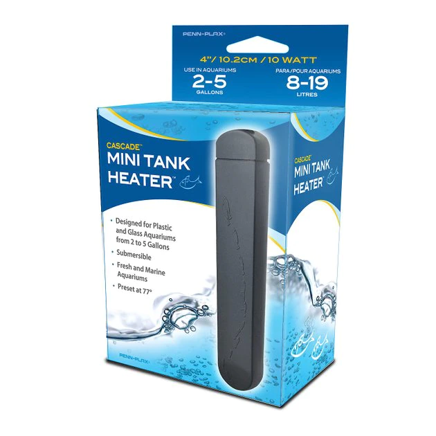 Designed with safety and durability in mind, the Penn-Plax 10W Plastic Safe Aquarium Heater accurately maintains a desired temperature of 77 degrees, which is ideal for most aquatic environments. It is fully submersible, and it can be placed horizontally or vertically with two suction cups for easy, secure placement in your tank. Plus, it’s easy to install—just plug it in and the heater will safely and efficiently bring the water to temperature. Made with superior insulation, it provides even heat distribution over the entire element. Features an automatic safety shut-off that cuts power to the unit if it is exposed to air. Fin-tastic for use in 2 – 5 gallon tanks!