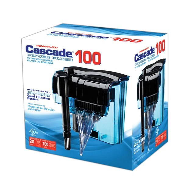 Help your finned friends breathe easily with the Penn-Plax Cascade 100 Power Hang-On Filter. This filter features a Bio-Falls Quad Filtration System to keep your tank fresh and clean! The polyfiber floss cartridge traps floating particulate matter—while the activated carbon cartridge removes harmful chemicals, toxins, odors, discoloration, and other contaminants from the water. The internal sponge optimizes the colonization of beneficial anaerobic bacteria while removing ammonia and nitrites. The external Bio-Falls wet/dry biological booster provides anaerobic bacteria for additional ammonia and nitrite removal, while enhancing oxygen exchange for maximum water oxygenation. It features an adjustable flow knob that allows you to reduce filtration during feeding times, or as needed. A leveling device keeps your filter in position, and the self-priming intake tube has a built-in, extendable stem to allow placement of the intake strainer close to the bottom of most aquariums. It is suitable for fish tanks up to 20 gallons in size.