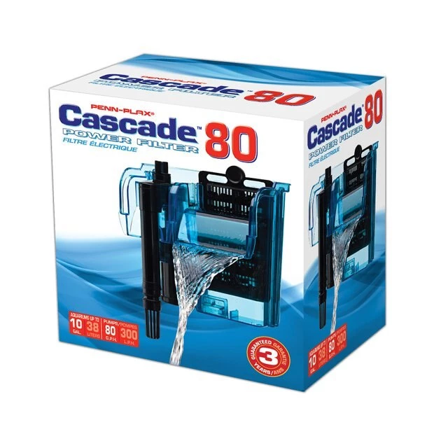 Help your finned friends breathe easily with the Penn-Plax Cascade 80 Hang On Aquarium Filter! This filter features a Bio-Falls Quad Filtration System to keep your tank fresh and clean! The polyfiber floss cartridge traps floating particulate matter, while the activated carbon cartridge removes harmful chemicals, toxins, odors, discoloration—and other contaminants from the water. The internal sponge optimizes the colonization of beneficial anaerobic bacteria while removing ammonia and nitrites. The external Bio-Falls wet/dry biological booster provides anaerobic bacteria for additional ammonia and nitrite removal—while enhancing oxygen exchange for maximum water oxygenation. It features an adjustable flow knob that allows you to reduce filtration during feeding times or as needed. A leveling device keeps your filter in position, and the self-priming intake tube has a built-in, extendable stem to allow placement of the intake strainer close to the bottom of most aquariums. It is designed to pump up to eighty gallons of water per hour and is suitable for fish tanks up from 1.5 to 10 gallons in size.