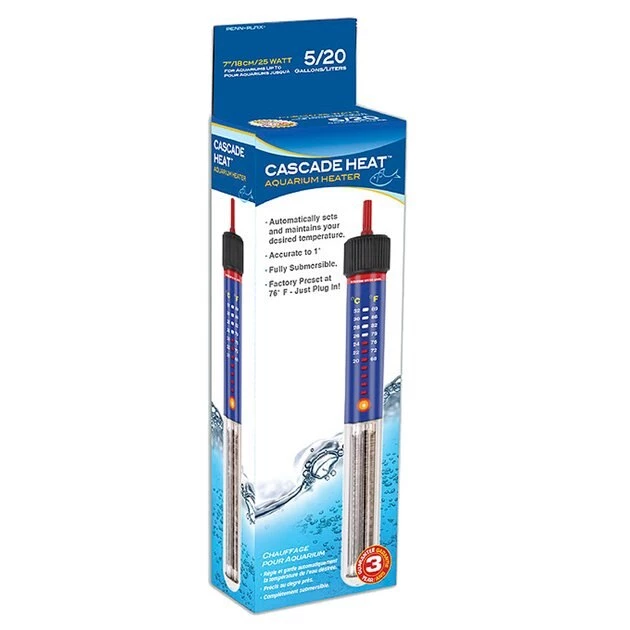 Designed with safety and durability in mind, the Penn-Plax Cascade Heat Preset Submersible Aquarium Heater accurately maintains the desired temperature in your tank within 1 degree of accuracy. The heater comes preset to 76 degrees, but it can be manually set to any temperature. It is fully submersible, and it can be placed horizontally or vertically with two suction cups for easy and secure placement in your tank. Plus, it’s easy to install—just plug it in and the heater will safely and efficiently bring the temperature of the water to your set level. Made with superior insulation and heavy-duty, shock-resistant glass, it provides even heat distribution over the entire element. It is safe to use in both freshwater and saltwater tanks up to 5 gallons in size. Keep your scaly sidekicks happy and healthy!