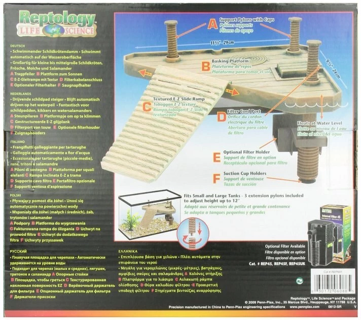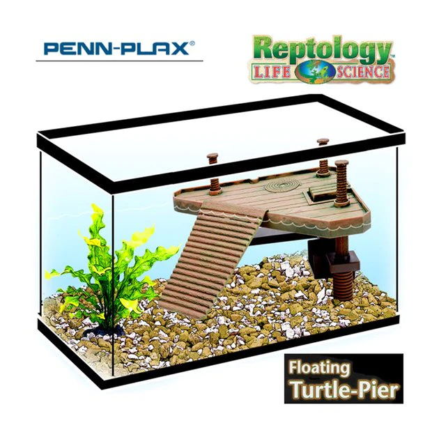 The Penn-Plax Floating Turtle Pier Platform has everything a basking platform needs for turtles, frogs, newts or salamanders. It’s designed to float at water level and allows you to maintain an ideal water level while compensating for evaporation. The textured ramp secures to the edge of the platform and leads down into the water for easy access to the basking ledge. Extension pylons are included to adjust the height up to 12″ (small) or 16″ (large), and the smaller platform includes an optional filter holder that fits the Penn-Plax Reptology Internal Filter 45 (sold separately). This platform looks like a real pier and works great in both small and large tanks.