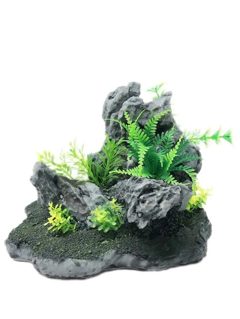 The Penn-Plax Grey Rock Scape Aquarium Ornament makes a natural addition to your aquarium. This aquascape can be used in place of gravel and features a beautifully crafted rock with vibrant plastic plants. The unit is weighted, ensuring it will stay securely in place. It’s made of a high-quality nontoxic resin, and then it’s hand painted for fine detail.