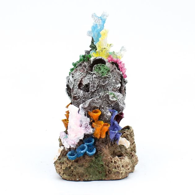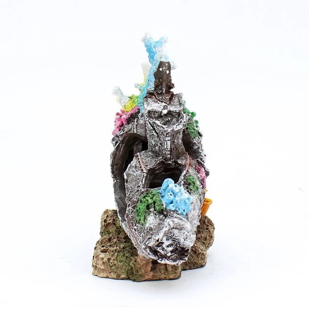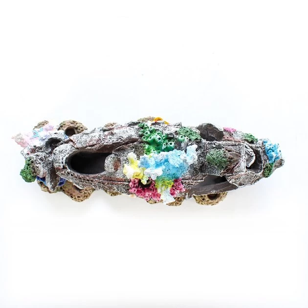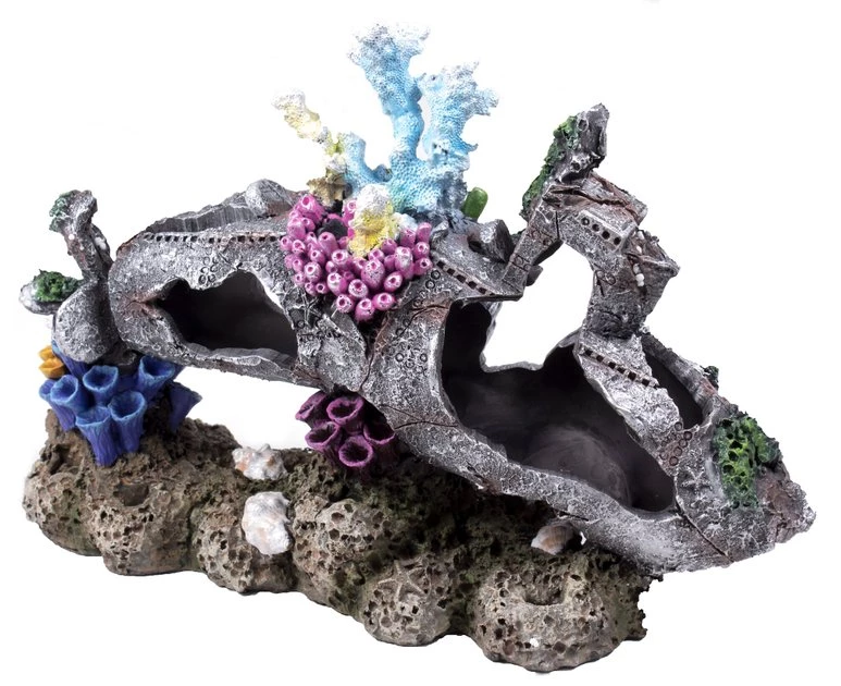 Add a few tasteful splashes of color to your tank with the Penn-Plax Grey Submarine Coral Aquarium Decoration! Intricately modeled after a submarine crash, this beautiful model is adorned with colorful coral in shades of pink, yellow and blue. Made of 100% fish-safe resin, this expertly crafted ornament creates depth and scale in your freshwater or marine tank for a unique oceanic element. Not only is it an excellent artistic addition, but it also helps make an enriching environment for your finned friends.