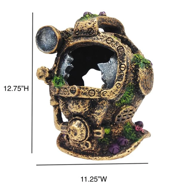 Give your fish pals a deep-diving adventure with Penn-Plax Large Diving Helmet Aquarium Decor. This resin ornament has the look of a long-abandoned diving helmet that the sea has reclaimed. It provides your favorite fish with a cool spot to explore along with multiple holes to swim through or hide in. The size makes it optimal for larger aquariums and it makes a wonderfully colorful and interesting addition to your tank’s landscape.