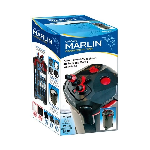 Give your fish friends a fresh and clean environment with the Penn-Plax Marlin Canister Aquarium Filter. This canister filter features adjustable valve taps that rotate 360 degrees and a fully adjustable flow rate—useful when you need a gentler flow. It also includes a smart valve-release mechanism designed for mess-free maintenance. The included bio-sponge and bio-floss help keep the tank clean and clear of debris. The canister also includes two large locking media baskets for storage. This filter is an ideal solution for keeping your freshwater or saltwater aquarium clean and clear for your finned pals!