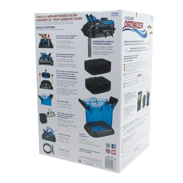 Keep your freshwater or saltwater aquarium sparkling clean with a Penn-Plax Optimizer Pre Fish Filter. This system filters large debris and particles before they reach your canister filter. It’s specially designed for large or dirty fish tanks that easily clog canister filters. Not only is it an additional stage of filtration, the pre-filter extends the life of your canister filter, so it runs smoother, longer. Plus, it comes with two bio-sponges—1 coarse and 1 fine. These sponges help optimize the colonization of anaerobic bacteria. The increased surface area also creates a larger biological bed. Last, the durable, non-slip grip pads at the base make it sturdy and long-lasting.