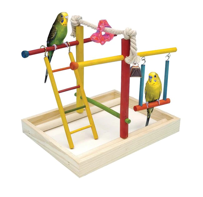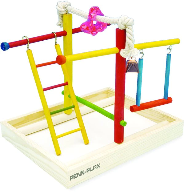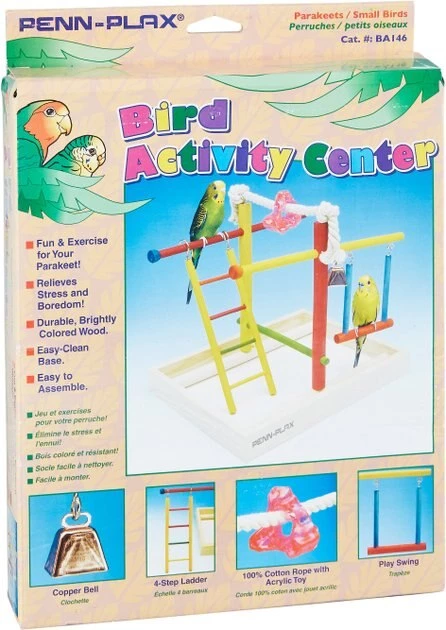 The Penn-Plax Parakeet & Small Bird Activity Center provides both exercise and entertainment for parakeets and small birds. This tiny bird gym is durable and easy to assemble and clean. It helps relieve boredom and stress and encourages healthy activity with 100% cotton ropes, colorful wooden perches, ladders, swings, copper bells and acrylic toys. Place it on top of the cage to give your pet bird a fun change of scenery.