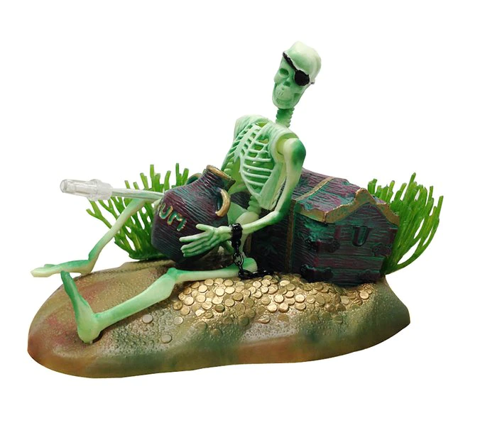 - Ornament features moving skeleton holding a jug, which is driven by filtration and air bubbles.