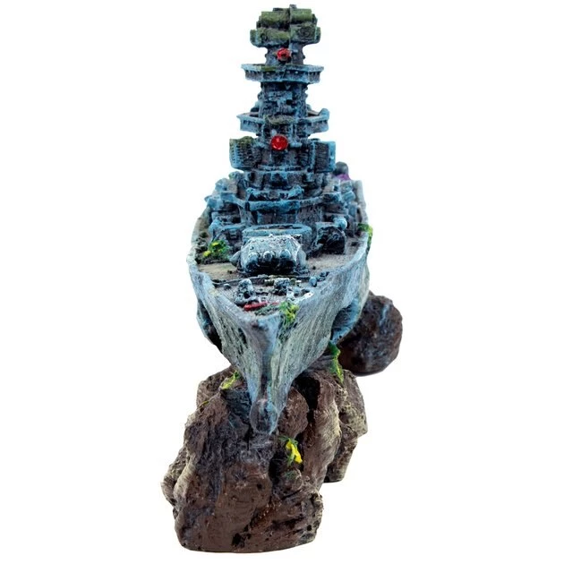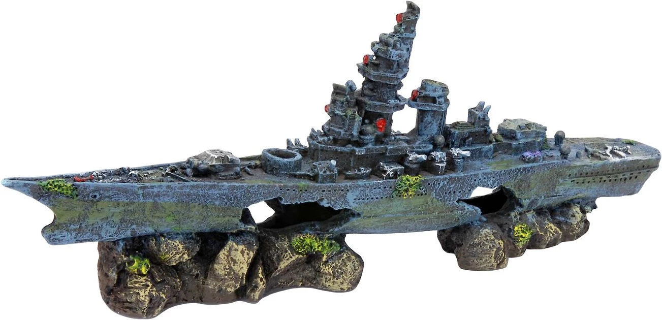 Add the Penn-Plax Sunken Battleship Aquarium Ornament to your aquarium to increase the visual appeal while providing shelter for your fish. This quality resin decoration is safe for both freshwater and saltwater environments. It will certainly liven up any tank with its colorful design and intricate detail, especially if you’re going for a nautical or shipwreck theme.