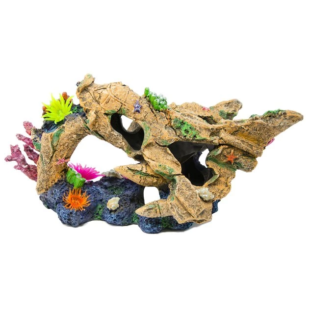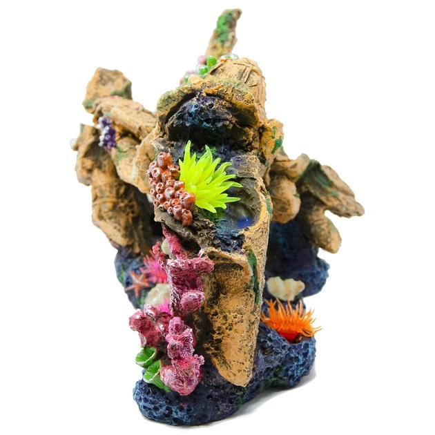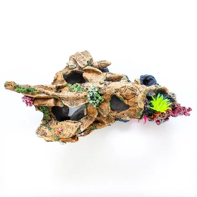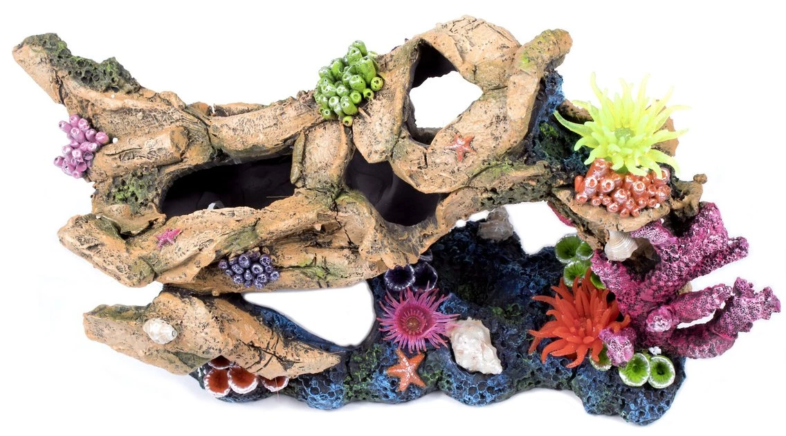 - Faux rock adorned with artificial coral.