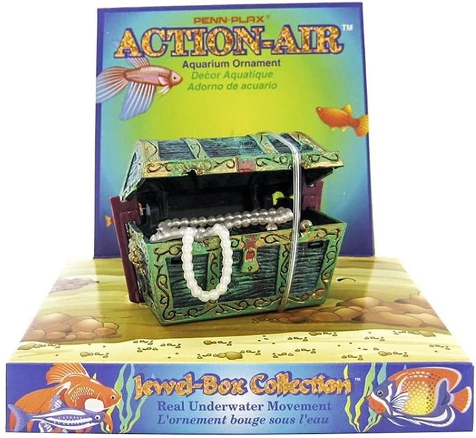 - Ornament features moving chest lid driven by filtration and air bubbles.
